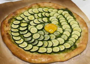 פיצה ירוקה - עם קרם תרד, פטה, צנוברים וחלמון